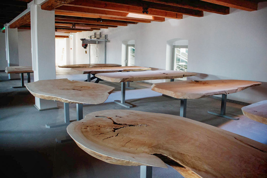 A bemutatótermek egy régi malom épületben találhatóak, Héderváron. A termeket azzal a gondossággal újítottuk fel, mint ahogy asztalainkat készítjük. Igazán megfelelő atmoszférájúak az asztallapok és kész asztalok közötti barangoláshoz. A termekben 700 m2-en állítunk ki félkész és kész alkotásokat.