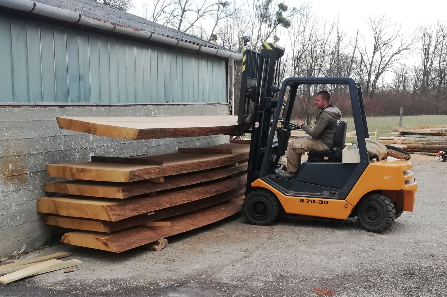 A nagyméretű tömörfa asztalok legyártása önmagában is egy kalandos történet, mivel szerencsére nem mindennap dőlnek ki gigantikus faóriások, így az alapanyagot fel kell kutatni. Készleteinkben található 2m átmérőjű 10 t-ás tölgy óriás is. Ahhoz, hogy egy többszáz éves matuzsálemből nagyméretű tömörfa asztal készüljön, először is ki kell jutni a helyszínre, ahol csak az erre a célra való famegmunkáló gépünkkel feldolgozzuk az alapanyagot. Ezek a helyszínek sok esetben csak gyalogosan közelíthetőek meg. Ezután ezeket az óriási fatáblákat beszállítjuk az asztalos üzembe, ahol hónapokig, akár évekig is száradnak mire elkezdhetünk dolgozni velük. A nagyméretű tömörfa asztalok alapjául szolgáló fatáblákat számos kezelésnek kell alávetnünk addig, amíg eljutunk egy komplett asztallapig.